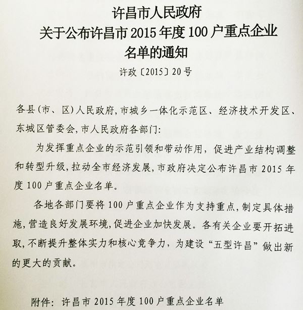 本次入圍,是市政府對(duì)公司為許昌市社會(huì)、經(jīng)濟(jì)發(fā)展所做貢獻(xiàn)的肯定,同時(shí)也為許昌公司2015年發(fā)展提供了良好的政策環(huán)境。