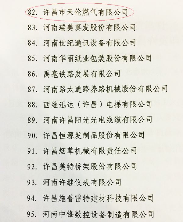 2015年2月28日,許昌市政府召開全市工業(yè)大會(huì),市長(zhǎng)張國(guó)暉主持會(huì)議。會(huì)議總結(jié)了2014年全市工業(yè)發(fā)展情況、部署了2015年工業(yè)和信息化發(fā)展工作,公布了許昌市100戶重點(diǎn)企業(yè)名單,許昌市天倫燃?xì)庥邢薰疚涣衅渲小?/span>