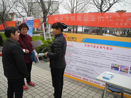 “誠實守信,安全萬家”是許昌天倫此次宣傳的主題。許昌天倫準(zhǔn)備了精美的安全常識展版、天然氣業(yè)務(wù)辦理手冊、安全宣傳手冊等宣傳物品,并設(shè)置了咨詢臺,安排客服部業(yè)務(wù)經(jīng)驗豐富2名員工為用戶提供咨詢服務(wù),并向過往的行人發(fā)放天然氣安全宣傳資料。此次活動的開展,進(jìn)一步增強(qiáng)了居民的安全意識和防范能力,樹立了公司良好的外部形象,受到廣大用戶的一致好評。