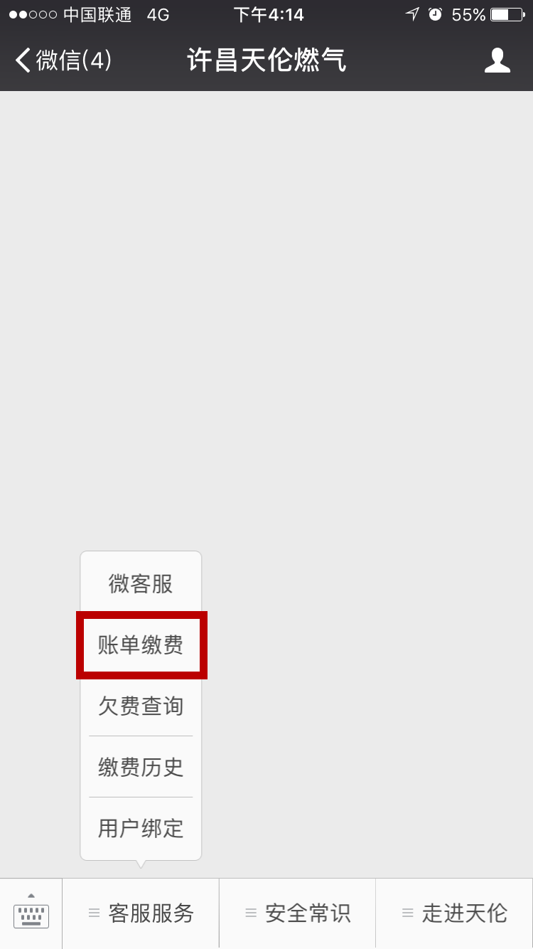 第四步進(jìn)入微信公眾號(hào)點(diǎn)擊客服服務(wù)→點(diǎn)擊賬單繳費(fèi)