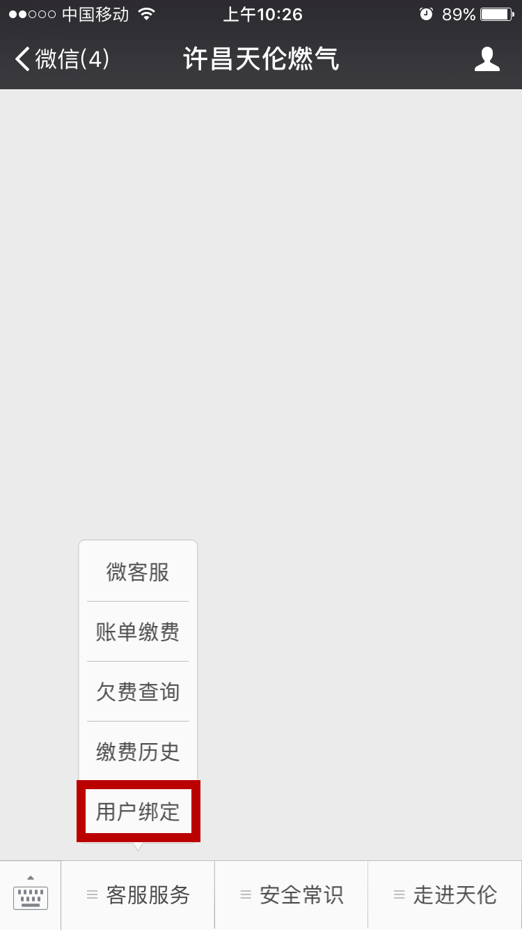 第二步進(jìn)入微信公眾號(hào)點(diǎn)擊客服服務(wù)→點(diǎn)擊用戶綁定