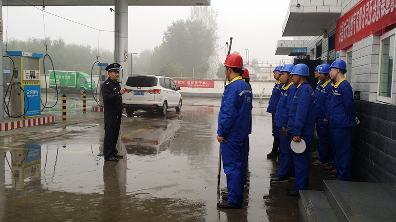 上午8時30分,鄧莊派出所、公司生產(chǎn)副總周總一行人員來到鄧莊CNG加氣站觀摩演練。9點整,演練準(zhǔn)時開始,鄧莊加氣站內(nèi)各項生產(chǎn)正常進行,9時10分左右,加氣工李亞軍發(fā)現(xiàn)加氣車輛內(nèi)有一位乘客,便要求駕駛員讓乘客下車在休息區(qū)等候,否則無法加氣。在與司機解釋讓車內(nèi)乘客下車的過程中,因該乘客處于醉酒狀態(tài),有點不耐煩,情緒逐漸失控,左手拿著打火機威脅炸掉加氣站,右手拿著伸縮棍要打加氣工,事態(tài)緊急。