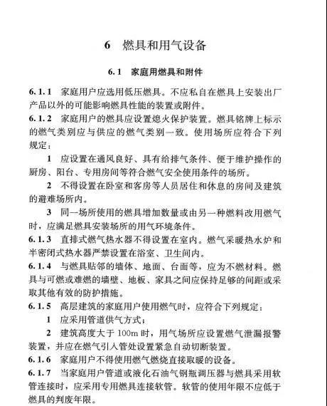 為規(guī)范家用燃?xì)馊紵骶?簡稱燃具)的安裝和驗(yàn)收,保證燃具安裝工程的質(zhì)量和用氣安全,制定本規(guī)程。本規(guī)程適用于住宅中燃?xì)庠罹摺崴?、采暖熱水爐等燃具及其附屬設(shè)施的安裝和驗(yàn)收。安裝的燃具應(yīng)符合國家現(xiàn)行有關(guān)產(chǎn)品標(biāo)準(zhǔn)的規(guī)定,且應(yīng)有產(chǎn)品合格證、安裝使用說明書和生產(chǎn)許可證。燃具應(yīng)由經(jīng)考核合格的人員安裝。燃具安裝及質(zhì)量驗(yàn)收除應(yīng)執(zhí)行本規(guī)程外,尚應(yīng)符合國家現(xiàn)行有關(guān)標(biāo)準(zhǔn)的規(guī)定。