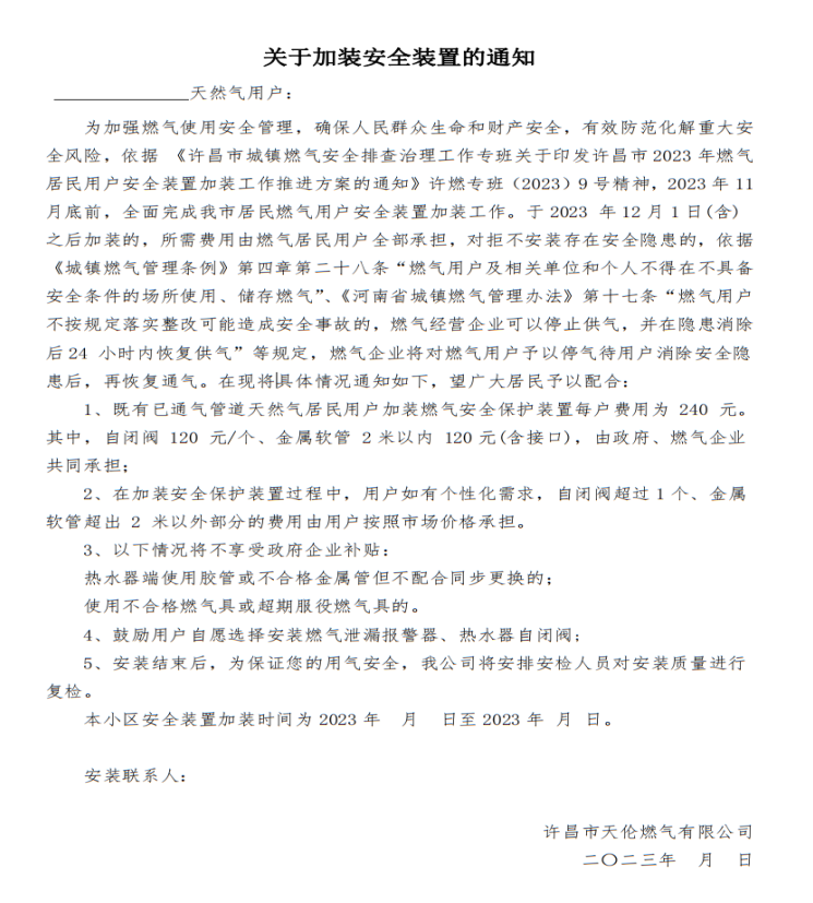 許昌市天倫燃?xì)?/span>居民用戶加裝安全裝置告知書